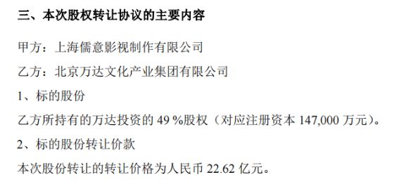 7月20日,万达电影的间接控股股东万达文化,与上海儒意影视制作有限公司签订《股权转让协议》,拟将其持有的万达投资49%股权转让给上海儒意,转让价款为22.62亿元。