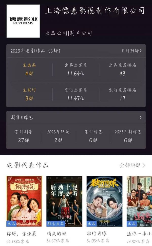 今年,上海儒意联合出品了票房近35亿的《消失的她》,还出品了《保你平安》和即将上映的《热烈》,2023年累计出品总票房11.64亿,发行总票房11.47亿。