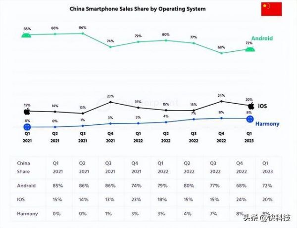 根据Counterpoint的最新数据报告,华为鸿蒙系统在中国的市场份额已经成为继安卓、iOS之后的第三大手机操作系统。
