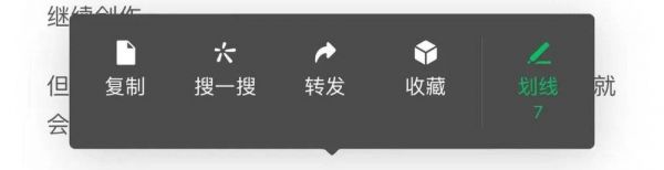 用户可以长按选中文本,然后在浮动菜单中选择“划线”。绿色标签内的数字表示该段被读者划线的次数。本人所划线处显示实线,其他用户划的则显示虚线。