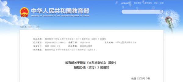 随着教育规模的不断扩大,高等教育由规模发展转向质量和内涵发展,本科学位论文的审查也逐渐严格起来。2021 年,教育部将本科阶段的论文抽检提上日程,于年初正式实行《本科毕业论文(设计)抽检办法(试行)》。明确本科毕业论文抽检每年进行一次,抽检对象为上一学年度授予学士学位的论文,抽检比例原则上不低于 2% ,由专家提出评议意见,不合格的毕业论文将认定为“存在问题毕业论文”。