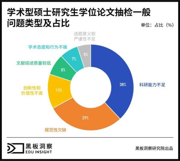 在硕士及更高层次阶段,北京大学教育学院教授陈洪捷,曾以学术型硕士研究生学位论文抽检专家评阅意见为研究对象,调查发现不合格学位论文大致存在“作者科研能力不足”“论文规范性欠缺”“论文创新性和价值性不高”“文献综述质量较低”“作者学术态度和行为不端正”及“选题意义和严谨性不够”六大问题,占比分别为 38%、29%、13%、8%、7% 和 5%。