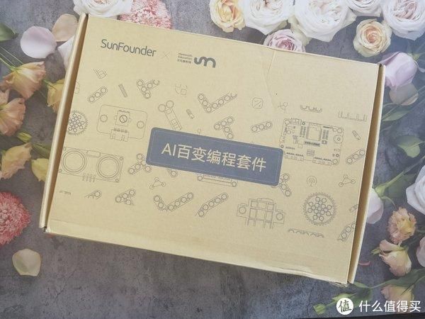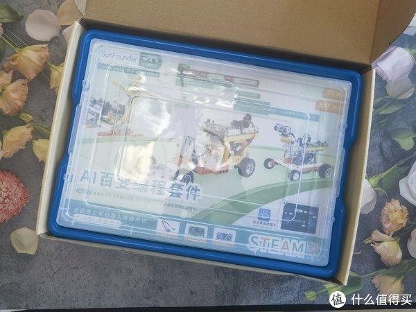 包装分两个部分,外包装就是一个普通的纸盒,上面印着积木和动力套件的简图,左上角有长毛象的商标,正中间是Al百变编程套件商品名称。里面一个蓝色透明塑料盖子的收纳盒。其实我觉得这款商品名称有点儿太技术化了,一般的人看了不感冒,会因为这个而错过一款有趣好的产品。
