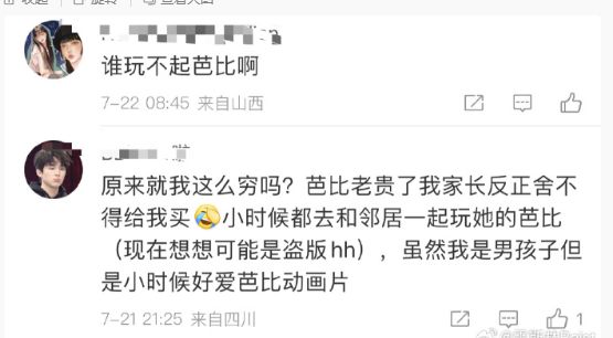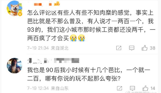 这几天甚至看人一本正经地说,她90后,小时候家里200块一个的正版芭比娃娃随便买,然后反问“谁买不起芭比娃娃”啊。