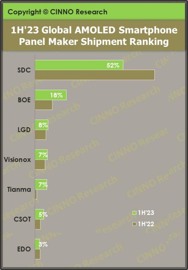 近期研究机构CINNO Research发布了2023年上半年(1-6月)AMOLED智能手机面板出货量数据。