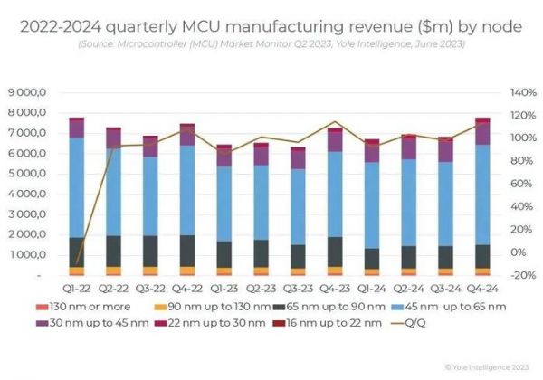 尤其是汽车MCU,对先进节点的需求较高。自动驾驶汽车需要处理大量的传感器数据,并实时做出复杂的决策,因此对处理器性能和能耗的要求非常高,使用先进制造节点的MCU能够提供更强大的计算能力,同时减少能源消耗,有助于满足这些挑战性需求。随着新的制程工艺的采用,MCU的性能和能效将进一步提升,以满足日益复杂的应用场景需求。