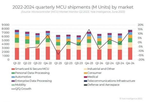 工业领域是一个相对较稳定的市场,出货量也相对变化不大,是MCU出货量第二大的市场。再就是个人数据处理的应用,在这个市场,MCU主要是用来帮助设备收集、处理和保护个人数据。然后是消费类、汽车,消费电子不必多说,汽车MCU是近年来关注度较高的市场,汽车“三化”进程正在加速带动车规级MCU单车用量增长。再就是医疗等领域,MCU在医疗设备中扮演着关键角色,从便携式医疗设备到健康监测器材,都需要高度集成的处理器来实现功能。