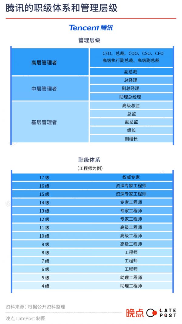据了解,腾讯目前的管理层级包括:高级执行副总裁—高级副总裁—副总裁—总经理—副总经理—助理总经理—高级总监-总监—副总监—组长—副组长。