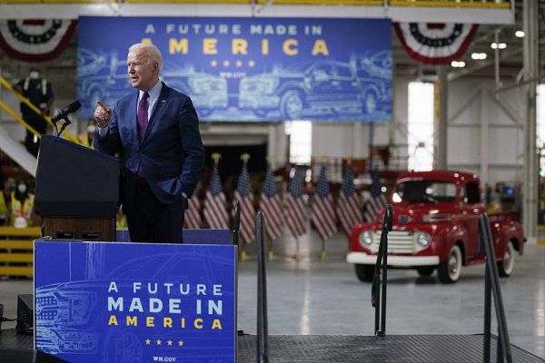 2021年5月18日,拜登参观福特汽车公司总部的电动汽车中心后发表演讲