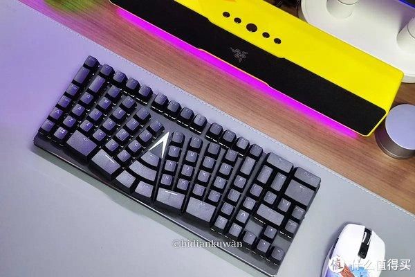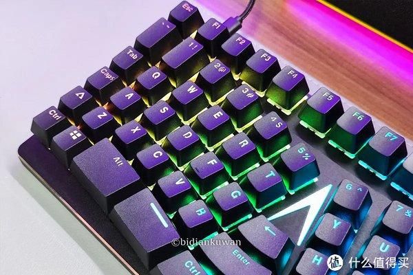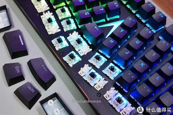 倒V字的布局中央,灯效辨识度自不用说。这些键帽也都是特有的设计,部分大键,包括中央的Enter键都有卫星轴保证敲击平衡度。特殊的改动,除了一分为二的空格键(左右手大拇指都能敲),也包括常用的Ctrl和Shift,左右两侧的Shift由大变小,中间多出一组Ctrl和Shift,当然烦,这两个键可以在驱动里自定义,码农喜闻乐见。
