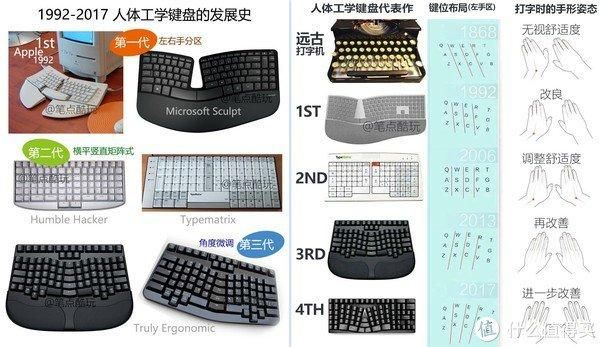 后来不需要这个限制了,人们也早就习惯了固有的键位安置,习惯却改不过来了。不仅如此,传统键盘那种别扭的敲字姿态也被迫延续下来,长时间打字,手腕酸痛很难避免。于是乎,某些大品牌开始考虑在现有键位的基础上对键盘布局做出改造,就有了我们后面看到的一系列人体工学键盘。