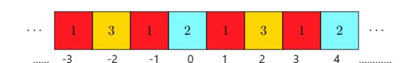 packing染色问题其实是在地图着色问题上加了更强的限制。当K={1}时,packing 1-染色问题就是最原始的地图着色问题,即要求相邻两个顶点颜色不同。我们先来看一个简单的例子,考虑下图中的一维整数轴,取图G=Z={0, ±1, ±2,……}为整数集,每个整数代表一个顶点,两个相邻的整数记为两个相邻的顶点,两个整数之间的距离定义为他们差值的绝对值。构造映射如下: