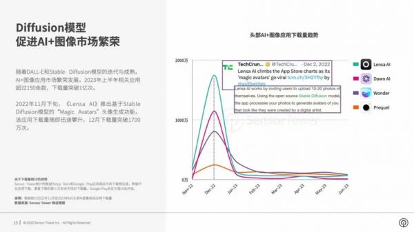 其中Lensa也是上传20张左右个人照片从而生成不同风格的头像或写真,同样采用会员付费解锁服务的模式。其在2022年12月靠AI照片生成应用“Magic Avatars”迅速霸榜美国、加拿大、英国等多国的App Store下载榜单,最高单日下载量一度超过1500万。