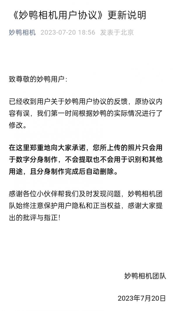 妙鸭相机回应霸道用户协议