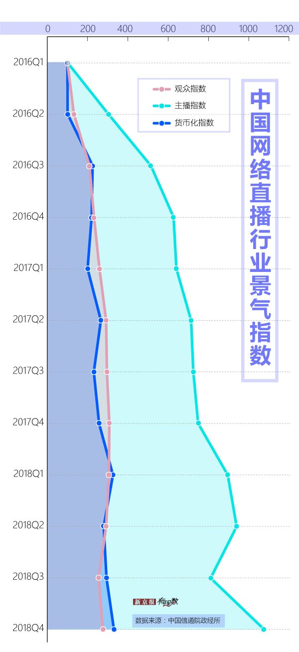 据中国信通院政经所今年 7 月发布的最新数据,2018 年下半年中国网络直播行业延续稳步上行趋势,截至 2018 年第四季度,中国网络直播行业景气指数升至 441 ,同比增长 19.5% 。