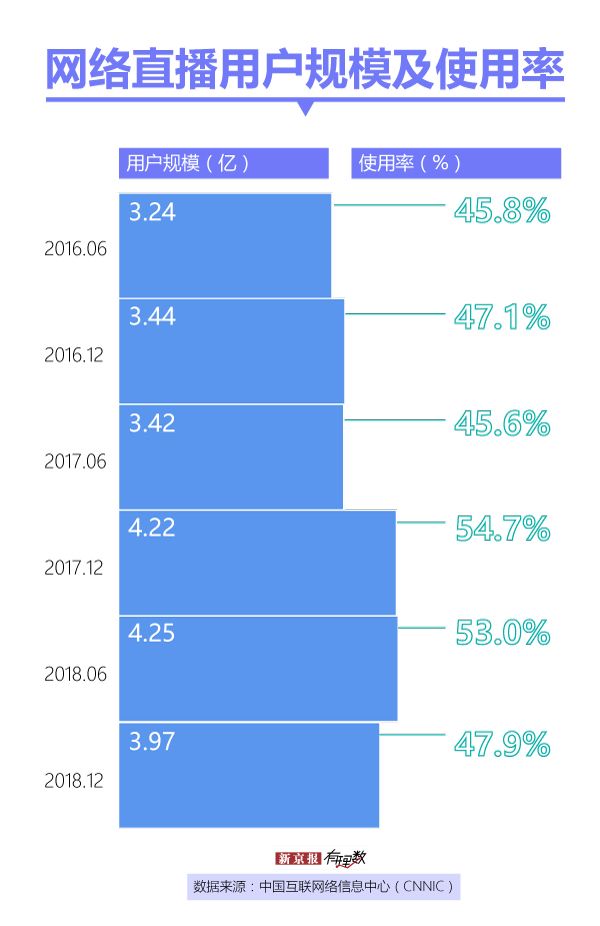 《第43次中国互联网络发展状况统计报告》显示,截至2018年12月,中国网络直播用户规模达3.97亿,47.9% 的网民都或多或少看过网络直播。