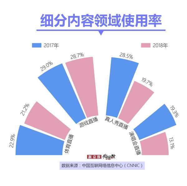 其中,真人秀直播的用户使用率从 2017 年的 28.5% 下降到 2018 年的 19.7% ,下降趋势最猛;游戏直播的用户使用率保持得最好,仅下降了 0.3 个百分点。
