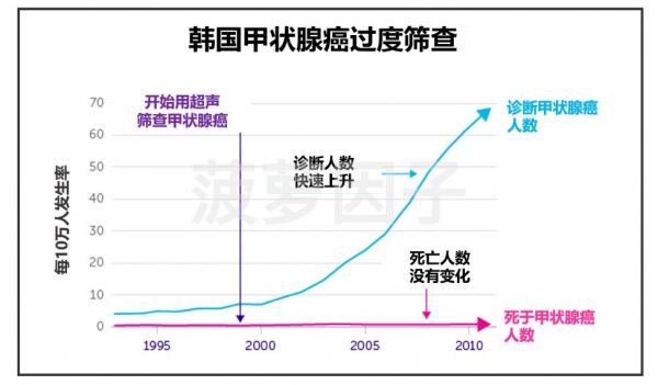 自从90年代韩国开始用超声筛查甲状腺癌,结果患者数量在短短的10年内暴涨了15倍!和中国现在情况几乎一模一样。