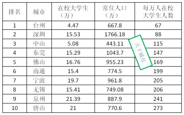 从这个排名中,我们可以看到,十大城市中除深圳和宁波是副省级城市之外,其它所有的城市,都是普通地级市。占优势的基本都是直辖市、省会城市。在前三十五名的城市中,几乎所有省会城市,以及直辖市,全部都高校充裕,在校大学生充裕。