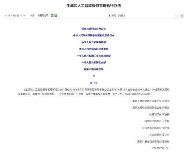 7月13日,完成修订后的《生成式人工智能服务管理暂行办法》正式出台,将于2023年8月15日起施行。