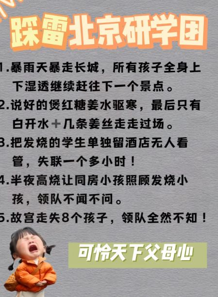与之相对的,则是有家长在抖音爆料,说有研学团不但让自家小孩冒着暴雨爬长城,而且有孩子在故宫都走丢了,领队甚至还对此一无所知。