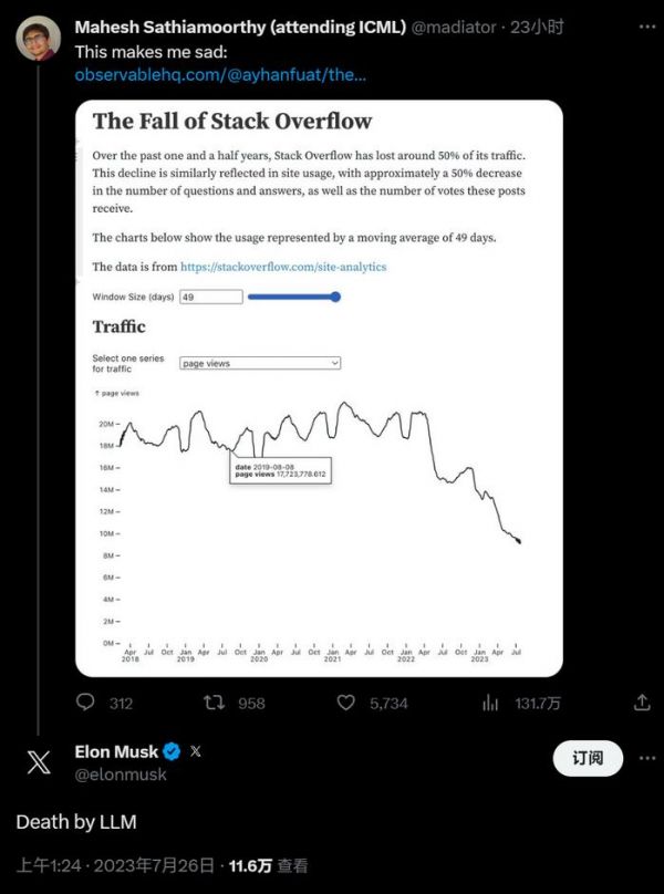 马斯克则对此表示:“LLM 将导致愈发普遍的(问答平台)死亡现象。”