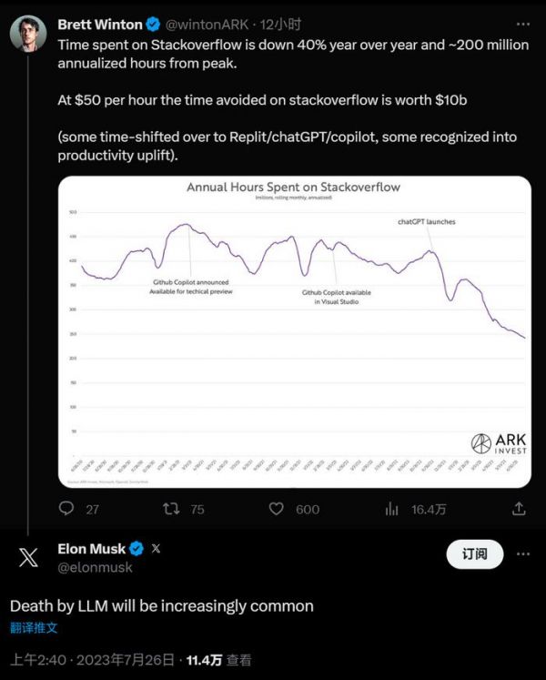▲ 图源 马斯克发布的 X's几小时后,马斯克又对方舟投资管理公司分析师 Brett Winton 发布的 Stack Overflow 数据图表进行了回应。