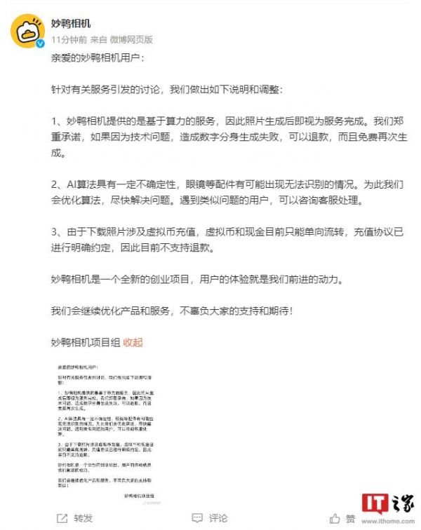 IT之家 7 月 26 日消息,今日妙鸭相机在官微发布公告回应退款争议,表示照片生成失败可退款,并对有关服务引发的讨论,做出说明调整。