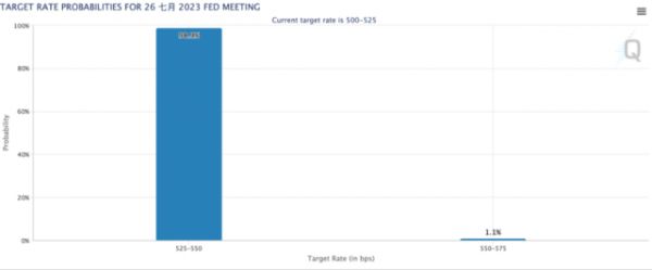 芝商所的美联储观察工具“FedWatch Tool”显示,7月加息25个基点的概率已达到了98.9%。