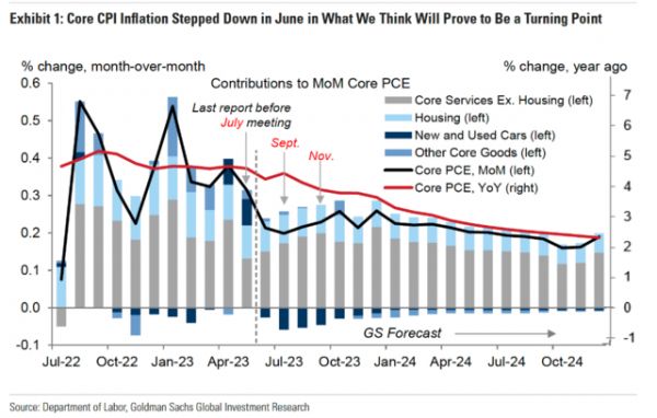 而高盛对美联储7月后的加息路径的看法与巴克莱的观点几乎完全相反,6月份核心CPI的大幅放缓,成为了美联储通胀故事的转折点。高盛强调,核心通胀居高不下,成为大多数市场预期FOMC将至少再加息两次的关键原因。