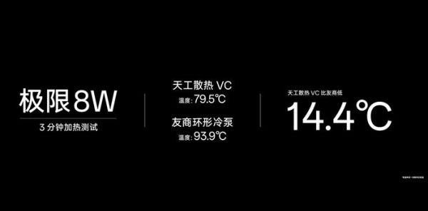 根据一加官方的测试,天工散热 VC 在 6.5w(原神重载场景的整机功耗) 1 分钟和 3 分钟的测试中,分别领先友商 8.5°C 和 12.8°C,在 8w(多重载后台同时运行的极限场景整机功耗) 1 分钟和 3 分钟的测试中,一加分别领先友商 8.7°C 和 14.4°C。