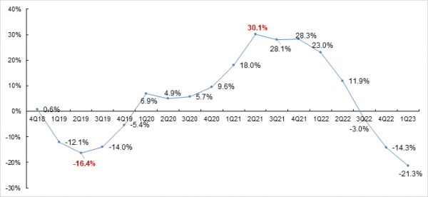 图 全球半导体季度销售额同比增速,来源:根据WSTS数据整理