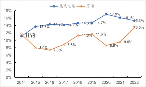 图 我国集成电路和原油的进口额占进口总值的比例,来源:根据海关总署数据整理。