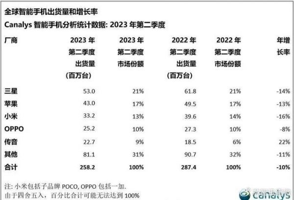 具体来说,二季度三星出货量为5300万部,同比下滑了14%,市场份额为21%,与去年同期持平;苹果出货量为4300万部,同比下滑了13%,市场份额为17%,也与去年同期持平;小米出货量为3320万部,同比下滑16%,是前五厂商当中同比下滑幅度最大的厂商,市场份额也由去年同期的14%下滑到了13%;OPPO出货量为2520万部,同比下滑8%,市场份额为10%,与去年同期持平;传音出货量为2270万部,同比大涨22%,市场份额由去年同期的6%提升到了9%。