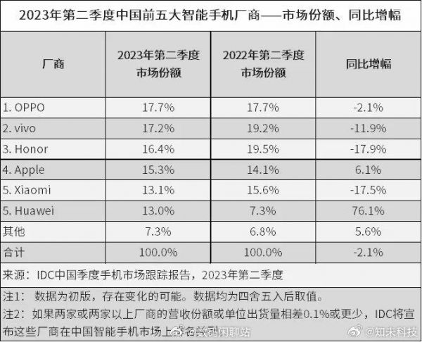 阿知不久前谈到,vivo在欧洲市场受到阻力很大,由于诺基亚的专利围剿,先是停止在德国销售产品,其后波兰授权经销商停止运营,近期又暂停荷兰地区销售服务,无疑是雪上加霜。在欧洲以外,vivo国内的主战场渐显颓势。2021年,vivo一度达到21.5%的国内份额,超过苹果位居第一;到2023年二季度,IDC统计显示vivo份额下滑至17.2%,同比环比均在掉,排名跌至第二。就是这样的百分比之差,让vivo失去战场优势,终于在全球范围内沦为“others”。