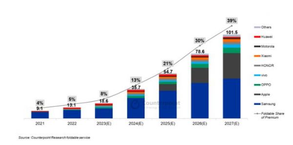 Counterpoint 表示,在这一预计的基础上,可折叠手机在 2025 年将占高端智能手机市场(售价超过 600 美元的手机)的 21%,到 2027 年将占 39%。这意味着,在苹果公司进入市场后的两年内,可折叠手机市场将达到 100 亿美元(IT之家备注:当前约 715 亿元人民币)。该机构预测,三星仍将是最大的玩家,可能是因为其有多款可折叠手机产品,而苹果公司的市场份额也将迅速增长。