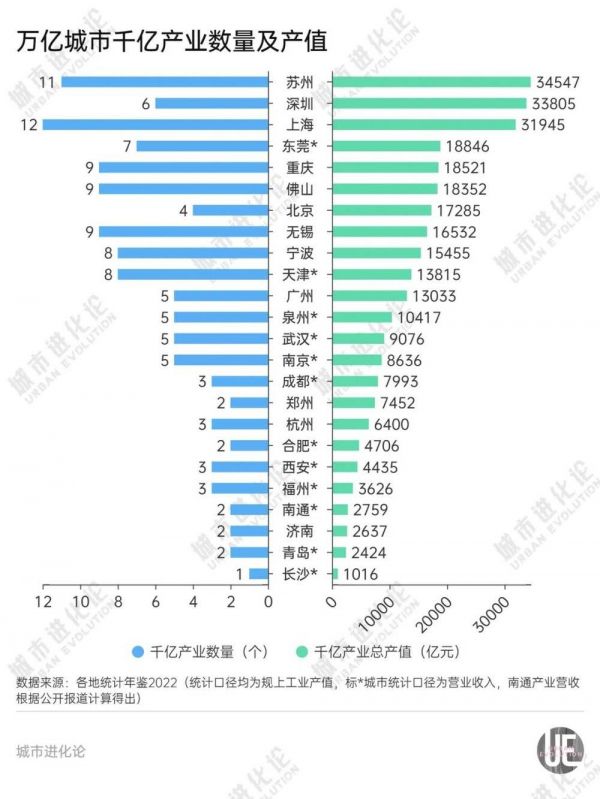 统计显示,常年稳坐“全国工业前三强”的苏州、深圳、上海,千亿产业产值均超过3万亿元,遥遥领先于其他城市。