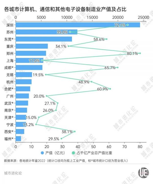 不仅如此,在24个万亿城市中,有11个城市产值最高的产业均为计算机、通信和其他电子设备制造业。