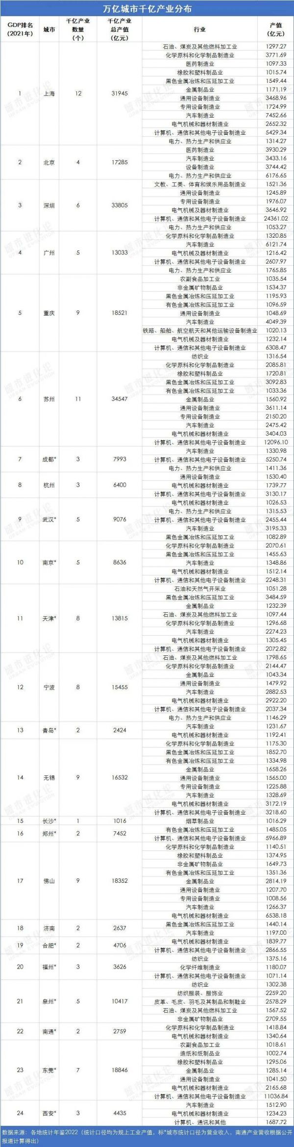 作为全国城市经济的“排头兵”,24座GDP“万亿俱乐部”城市,各自拥有多少千亿产业?谁产值最高?谁的潜力最大?通过各地2022年统计年鉴公布的工业数据,城叔梳理出万亿城市千亿产业(产值超过千亿元的产业)分布情况。