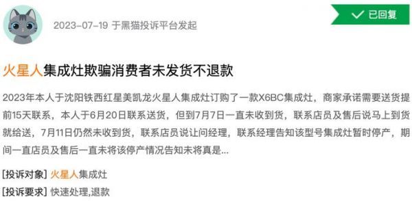 近期,乐居财经《家居K线》从知名的消费者投诉平台“黑猫投诉平台”获悉,火星人新增了一起消费者投诉表示“火星人集成灶欺骗消费者未发货不退款”。
