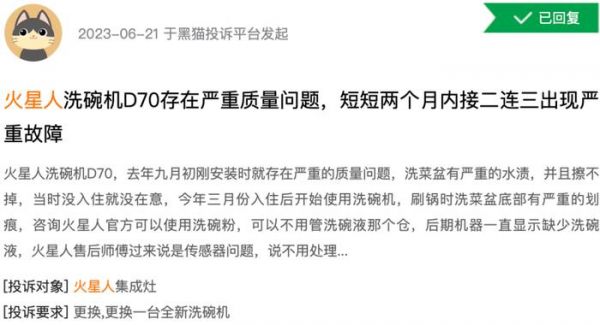 除了火星人的王牌产品集成灶被多位消费者投诉外,上个月还有消费者投诉称火星人洗碗机D70也“存在严重质量问题,短短两个月内接二连三出现严重故障”,其详细描述,去年9月安装时,就发现该洗碗机存在严重的质量问题,洗菜盆有严重的水渍,正式入住后又发现刷锅时洗菜盆底有严重划痕。同时,该洗碗机还存在多次无故提醒和故障提示。该消费者按照火星人售后指示,更换了主控板,高压泵,高压泵驱动器等多个喷溅后,还是提示故障信息。且洗碗机在使用过程中还存在洗碗粉未化开、洗不干净油渍,留有水渍等多重问题。