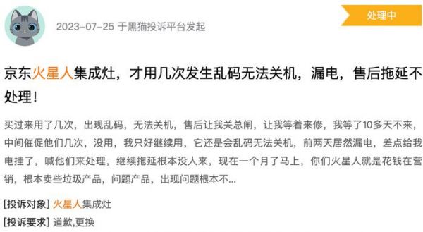 同月,另一位消费者投诉表示,自己在京东购买的火星人集成灶,才用了几次就发生乱码无法关机,联系火星人售后后,等了10多天还没有来,催促无果,该消费者只能被迫继续使用该集成灶,但在后续又出现了漏电的新问题。截至投诉当天,消费者表示已联系售后快一个月了,但始终没有人上门维修。