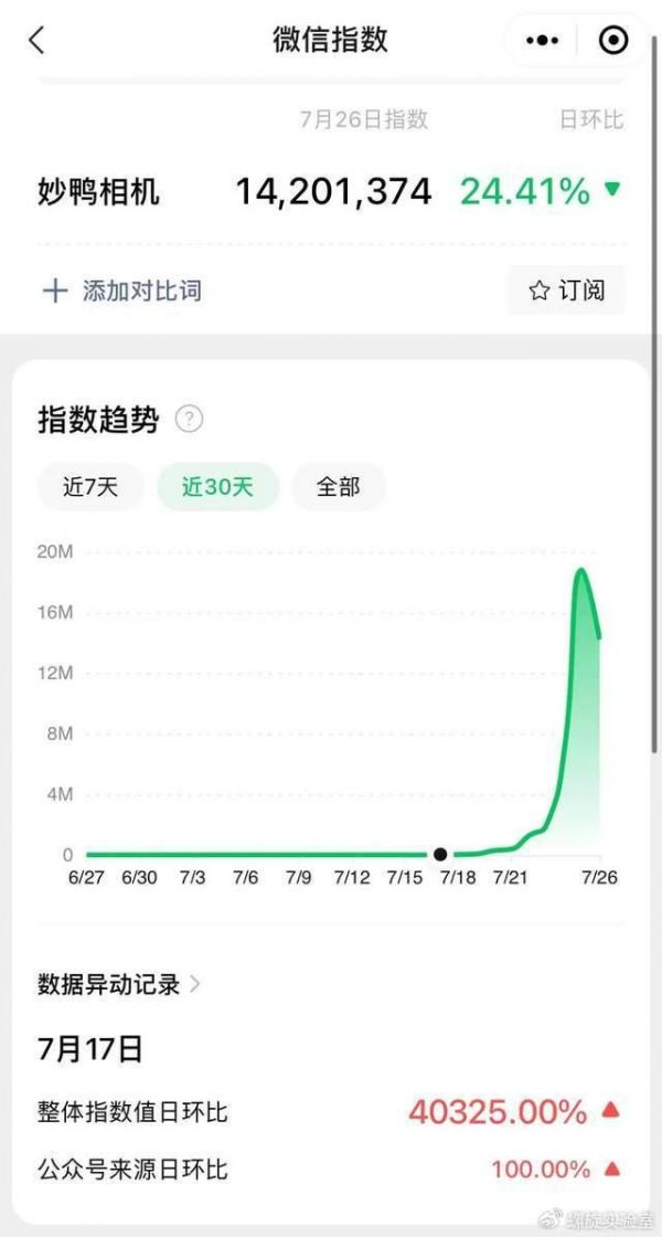 自6月30日开始邀请制内测,7月17日正式开放使用以来,“妙鸭相机”的走红令人猝不及防,尤其在近几日,微信指数显示其热度更是呈直线上升。