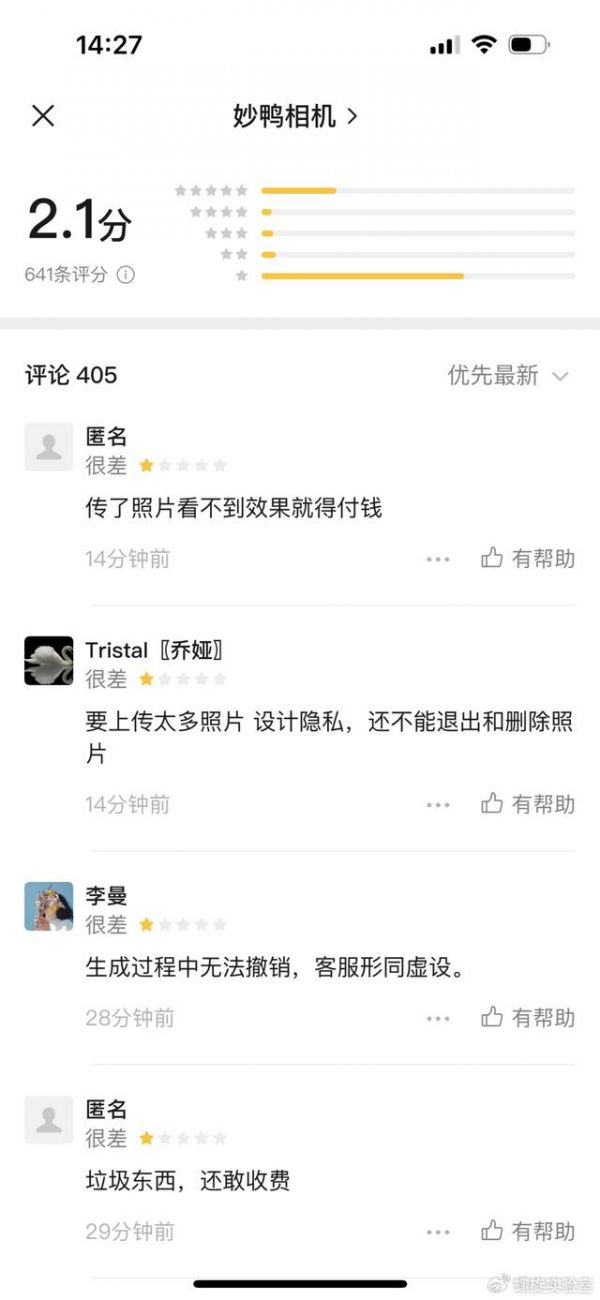 而即便是完成了这样的要求,生成的照片也并非能符合每个人的喜好,目前妙鸭相机的小程序评分已经跌至可怜的2.1分,其中不少差评都是因为用户感觉生成的照片未能达到预期效果。