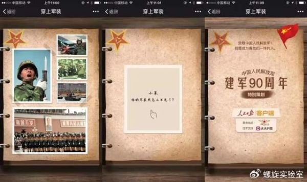 2017年,为纪念建军90周年,人民日报客户端联合天天P图和腾讯云共同推出了H5产品《我的军装照》,成为了当年现象级的互联网传播案例,用户只需要上传自己的照片,并选择相应年代,通过人脸识别即可以生成属于自己不同年代的军装照。