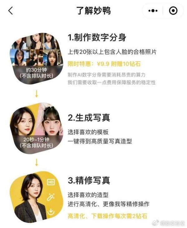 什么是妙鸭相机,官方介绍显示,在妙鸭相机里,用户可以通过上传一些自己的照片,就可以拥有一个专属的数字分身,然后挑选你喜爱的写真模板,就可以得到一张张专业质感的写真。