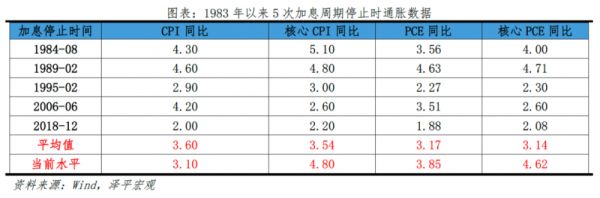 从通胀的角度看,1983年至今的5轮加息周期停止时,美国CPI同比平均为3.6%,核心CPI同比平均为3.54%,PCE同比平均为3.17%,核心PCE同比平均为3.14%。