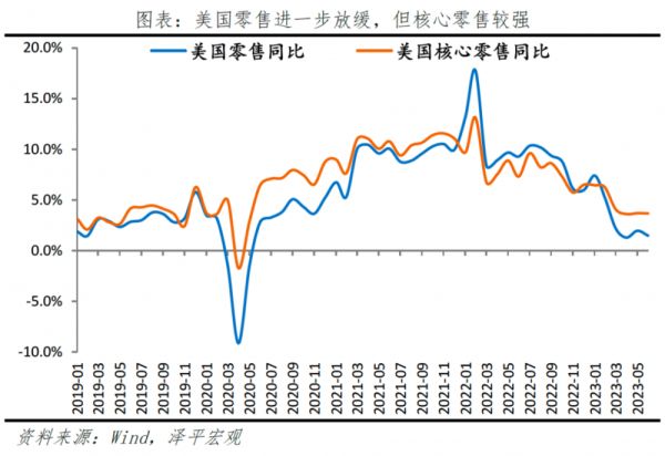 我们认为后续美国居民消费将成为最重要关注点。美国居民部门超储大量消耗后,消费需求下降冲击美国劳动力市场,从而对薪资和通胀产生影响。当前,美国零售消费同比持续走弱,但核心零售依然较强;反映美国居民超储以及薪资收入仍持续托底消费。美国6月核心零售在网络零售的带动下,同比3.68%。