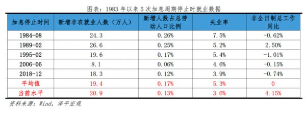 从就业的角度看,1983年至今的5轮加息周期停止时,美国新增非农就业同比平均为19.4万人,新增就业人口占劳动力人口比例为0.17%,失业率为5.3%,非全日制总工作同比持平。