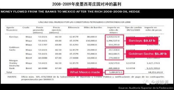 从交易对手看,高盛是最早、也是最主要的墨西哥政府石油期货对冲交易的对家,巴克莱、摩根士丹利、德意志银行、花旗集团、汇丰银行和法国巴黎银行等金融机构后也参与。最新的对家,除了上述金融机构之外,还发展到壳牌这样的石油企业的贸易机构。